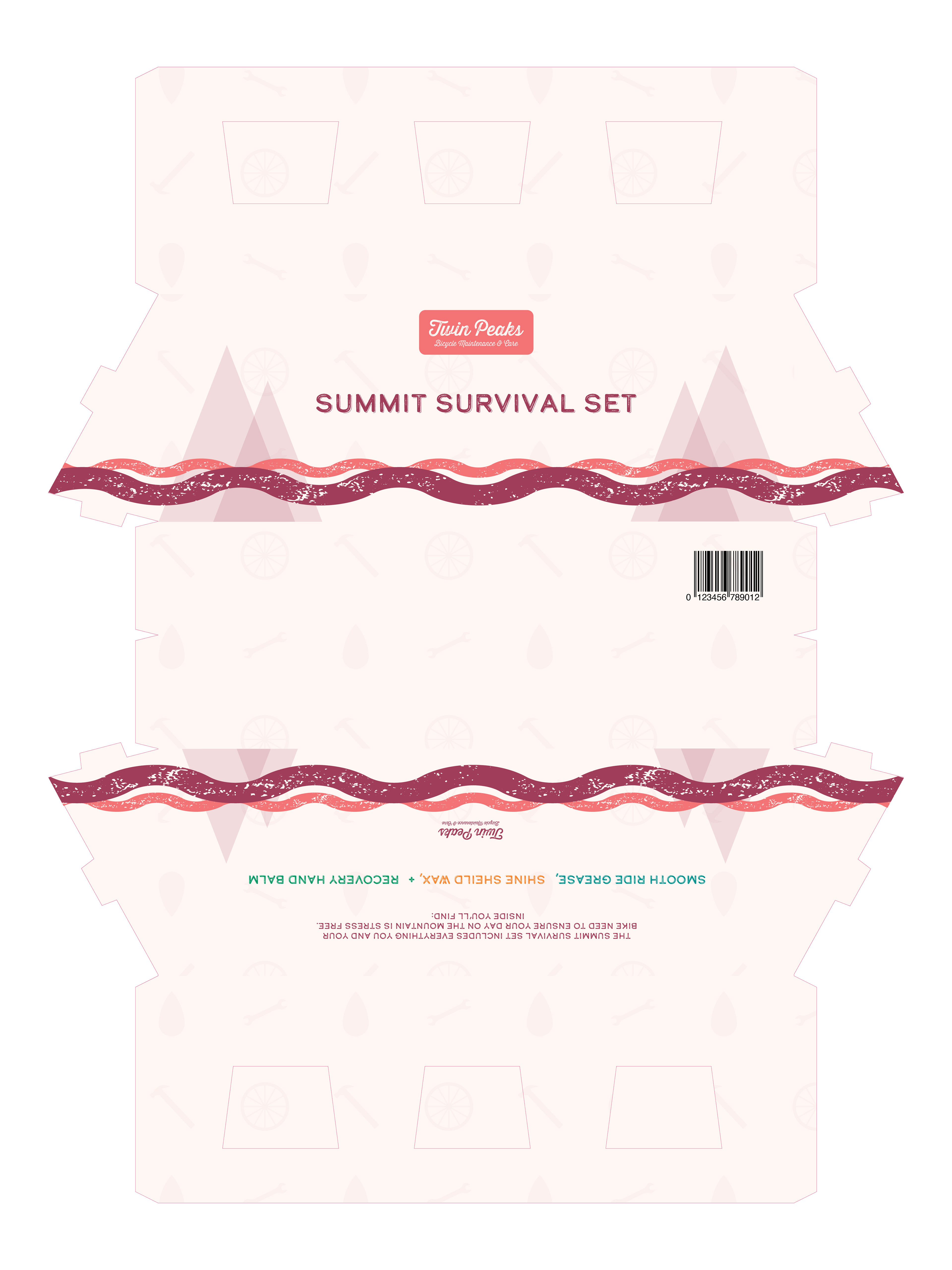 A brand concept for mountain bike maintenance products. Includes key elements such as: a brandmark, a wordmark, & patterns. The packaging might be my favourite part — it folds up into two mountains that hold the three tins of grease, wax, and balm between them.